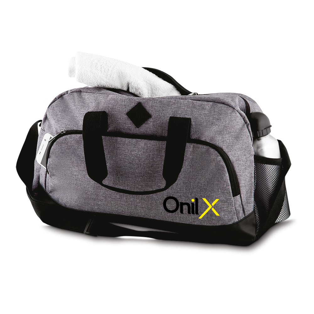 Bolsa esportiva de poliéster. Possui bolso frontal, bolso lateral de malha e bolso grande superior. Alça de mão com pegador cinza de velcro e alça transversal ajustável.