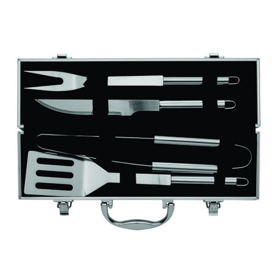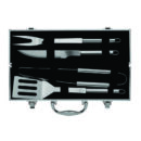 Kit churrasco 4 peças em maleta de alumínio com travas de segurança, contém: espátula, pegador, garfo e faca em inox. Parte interna da maleta com revestimento em tnt e suportes de velcro para fixação das peças.