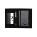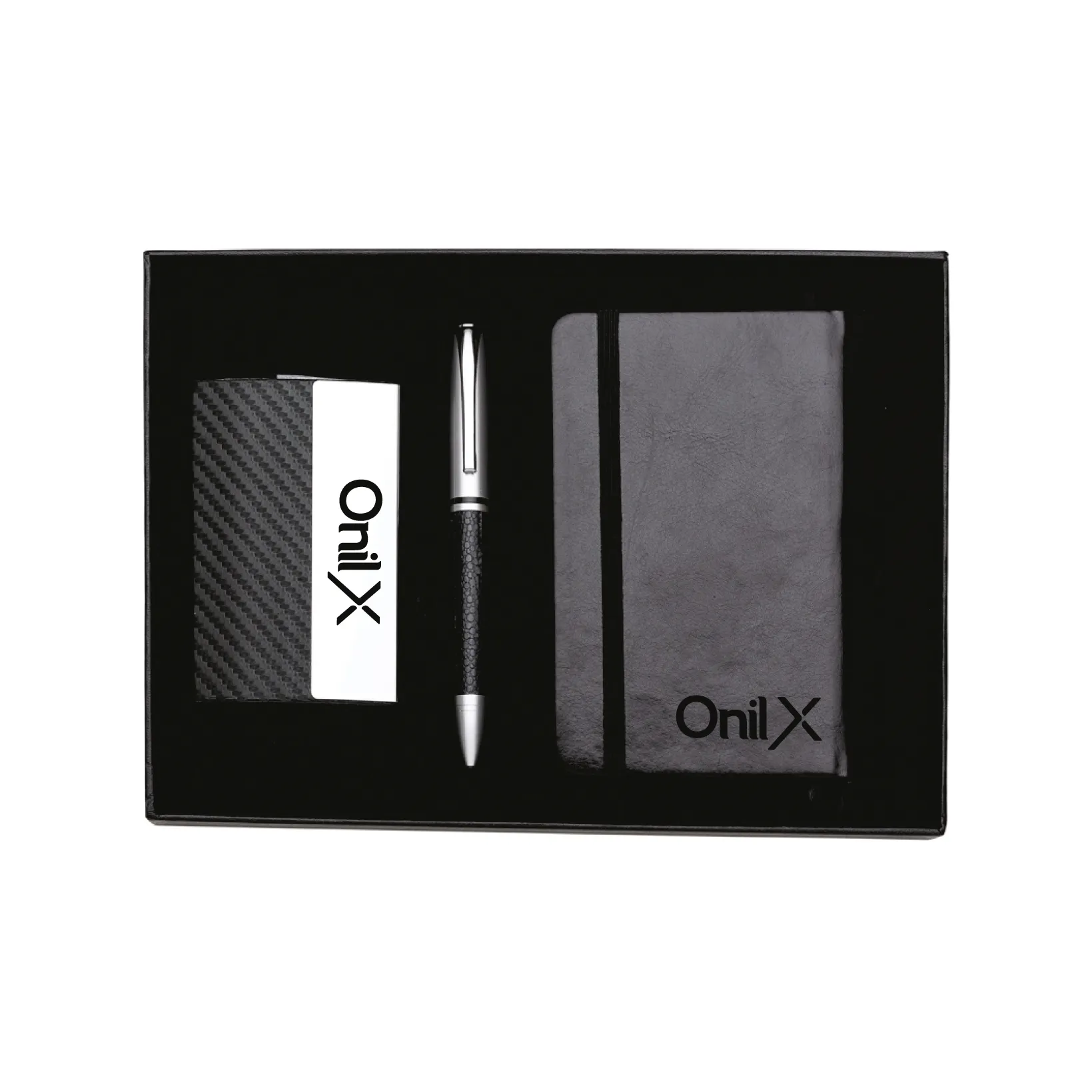 Kit executivo 3 peças em estojo de papelão com tampa e parte interna revestida de espuma. Contém: porta cartão de couro sintético texturizado com detalhes prata brilhante, caneta metal fosca com detalhe emborrachado preto, caderneta em couro sintético com aproximadamente 80 folhas amarelas pautadas. Acompanha placa metálica para gravação.