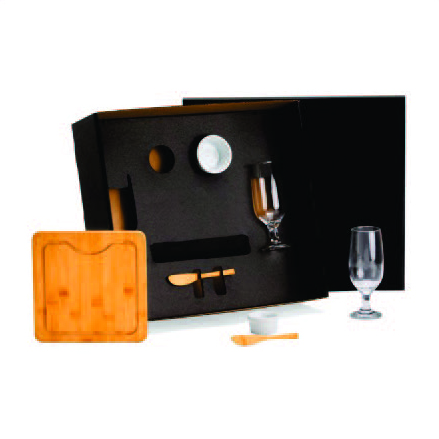 Composto por tábua quadrada e duas espátulas de 14 cm em Bambu; dois ramekins em porcelana e dois copos em vidro para Cerveja.